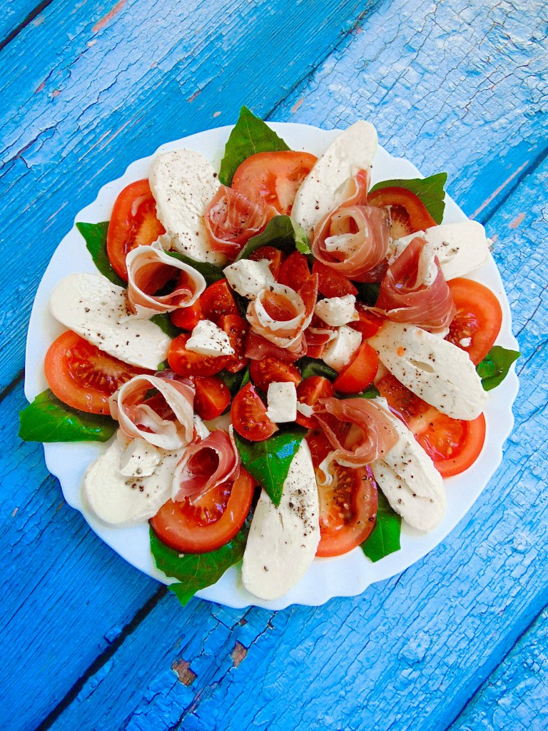 Ironically, when plating this up for the photo, I was scolded and told by someone who lived in Italy for many years ‘This isn’t a Caprese Salad – Italians lay it out differently’ and then the plate was rearranged and the eagle eyed among you will also note that I add prosciutto to the salad, for I have been told this does not make it a Caprese Salad. So, to limit any tomato throwing at me, I called it a Caprese Salad with Prosciutto. But rest assured, when I make this without the looming photography session and the guidance of someone who lived in Italy, the ingredients will end up on the plate however my hand sees fit at that time.