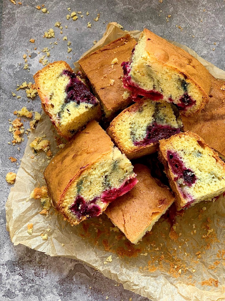 I baked this cake one Saturday when I knew my friend was popping over later. It started life in my head as a two-tier affair with buttercream and fruit on top and then I realised that I didn’t have time for the fruit to thaw so I said sod it and just threw it in the batter and make it a square bake.