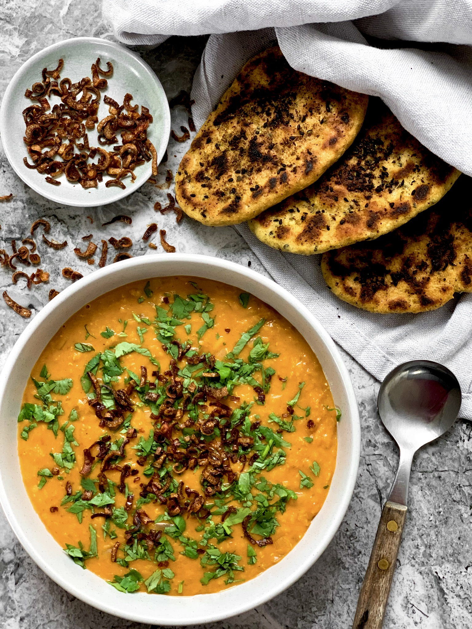 - The dal can stand off the heat and covered while you make the naan breads, or simply enjoyed straight away topped with some freshly chopped coriander and a sprinkling of the crispy shallots.