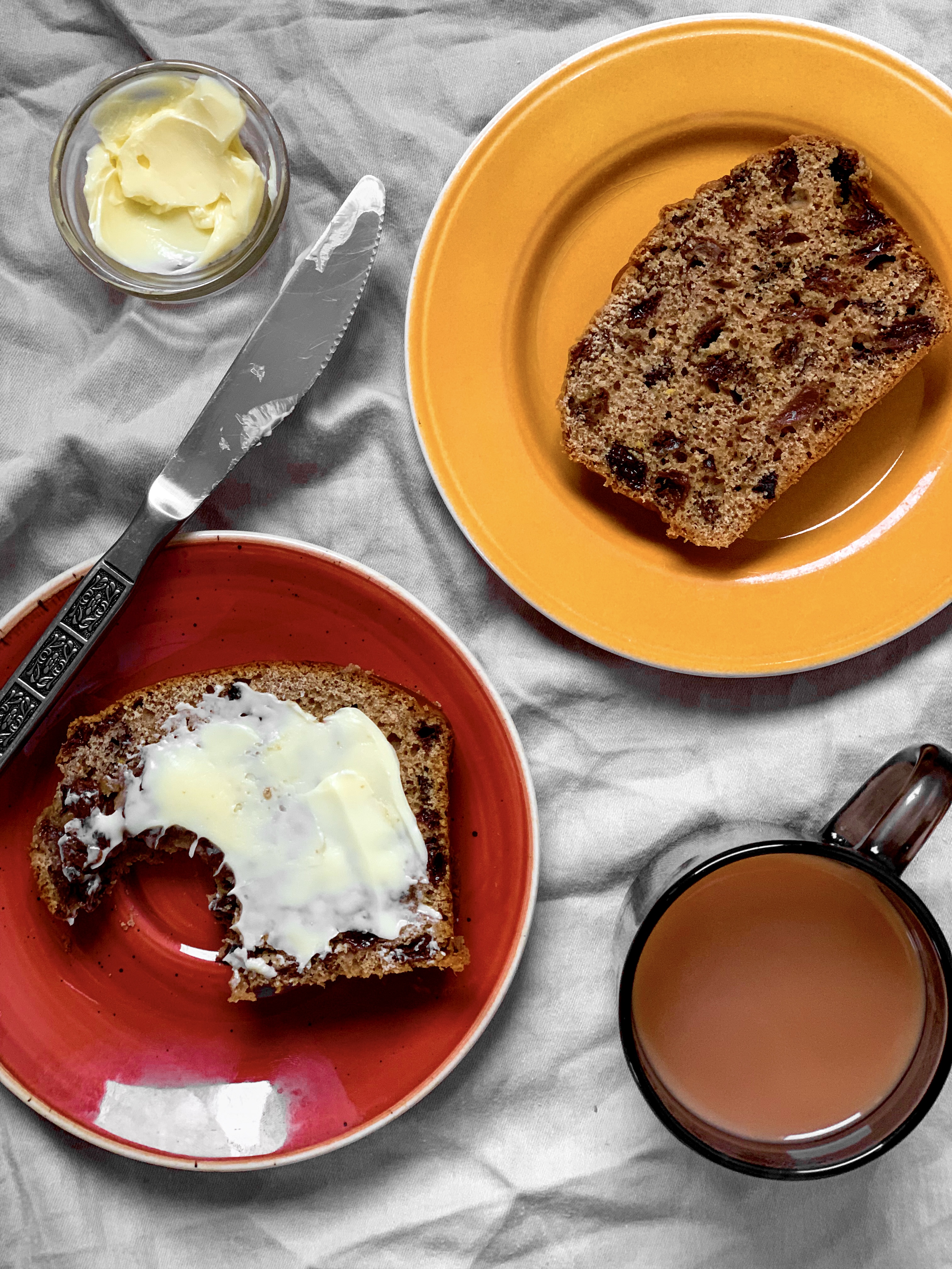 Every time I eat this it always takes me back to a day when a grandmother would make Bara Brith, wrap it in parchment, tie it with string and leave on the doorstep of a neighbour with a little note. I have no idea who’s grandmother this is, because it definitely wasn’t mine (or any of my neighbours, for that matter) but it has that cute, old-fashioned, bread-and-butter kind of charm to it that feels traditional but unfussy at the same time.