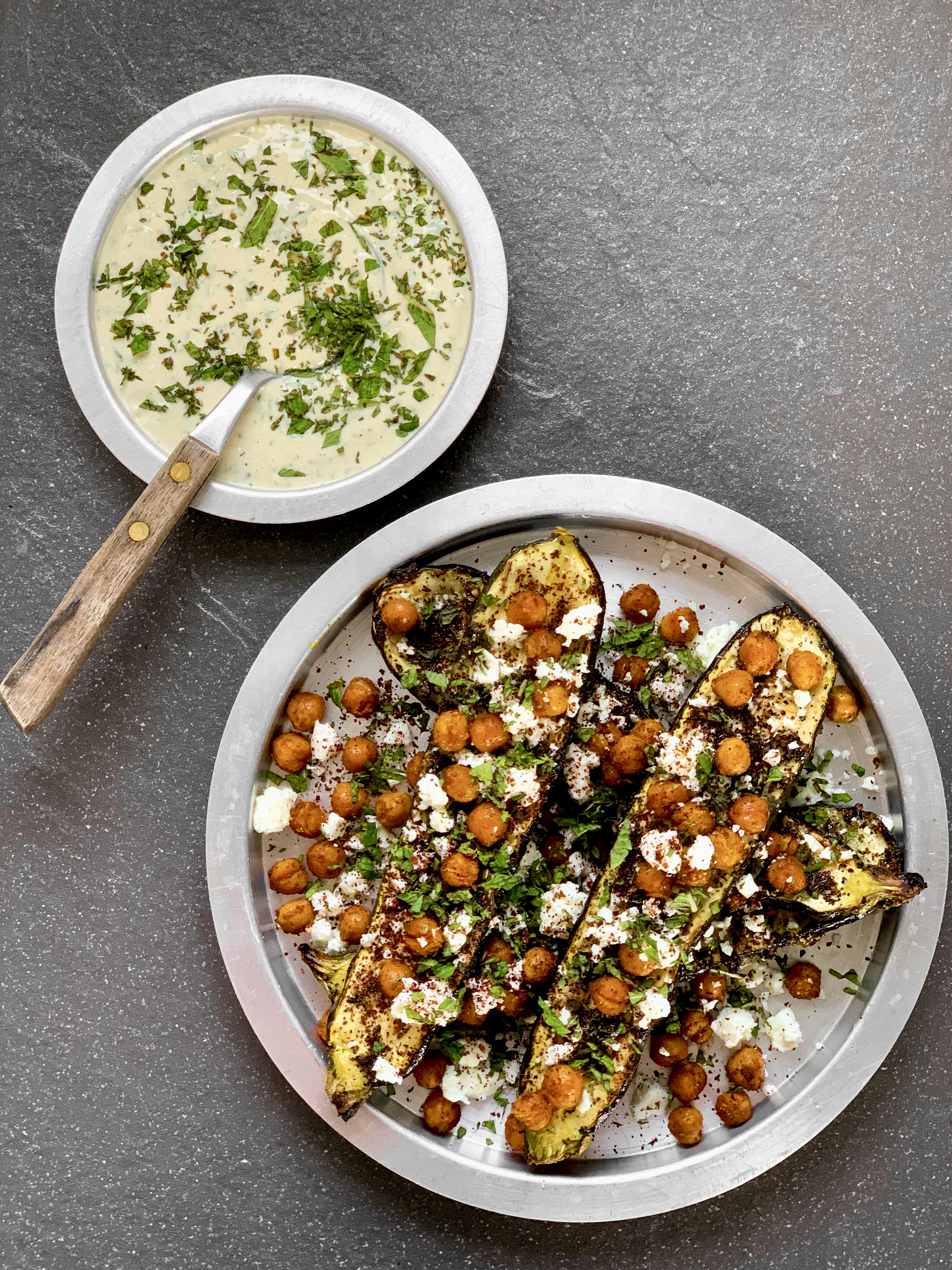 - Remove the courgettes from the oven, and serve scattered with the baked chickpeas, feta, some fresh mint, and the yogurt sauce on the side.
