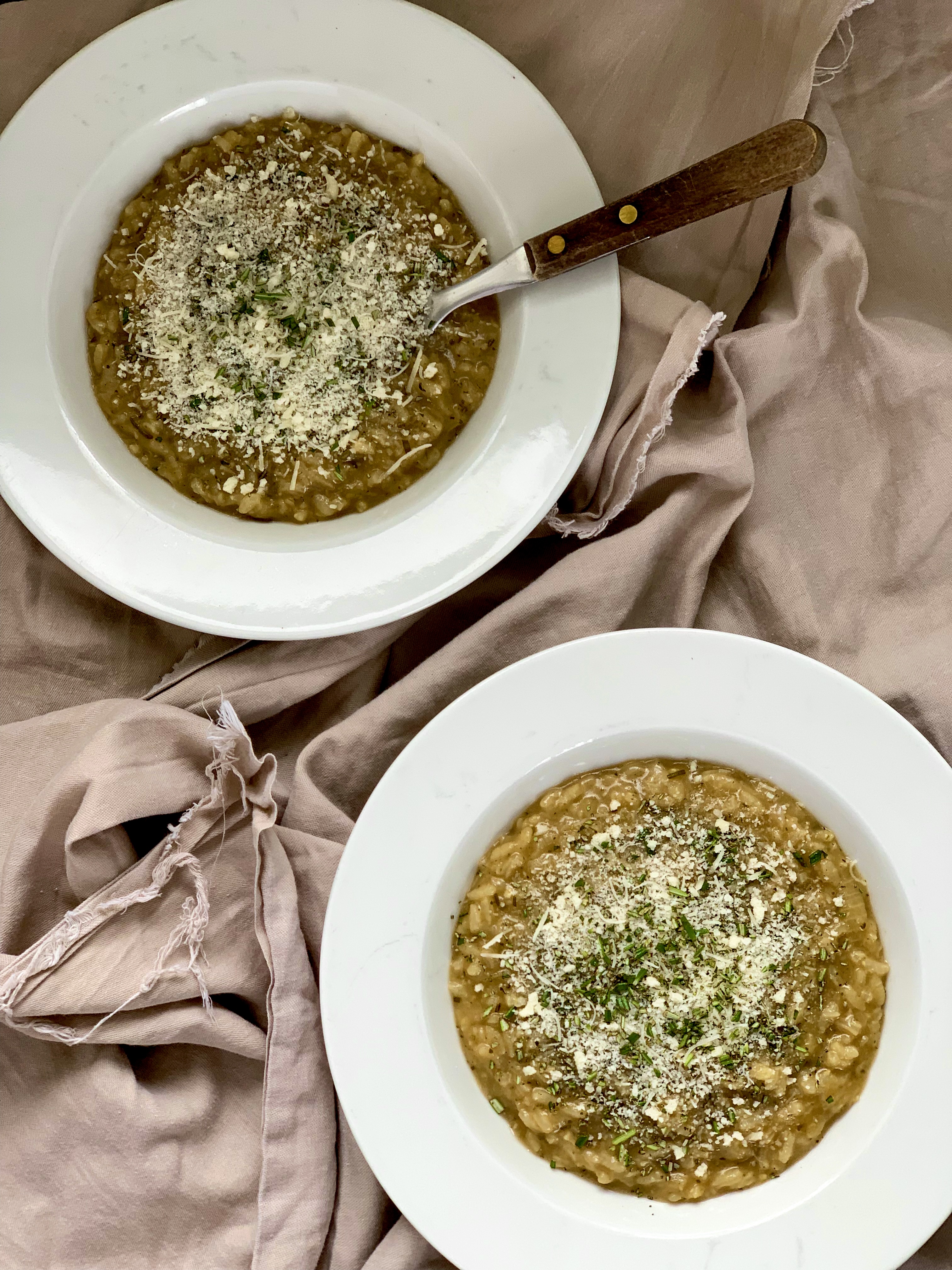 Imagine all the flavours of a French Onion Soup, deep in its hearty, beefy, golden unctuousness, but delivered through the creamy, nubbly density of a risotto. This is that, and while it asks for you to stand by your stove for a little longer than you’d possibly want to of an evening, it is absolutely worth it.