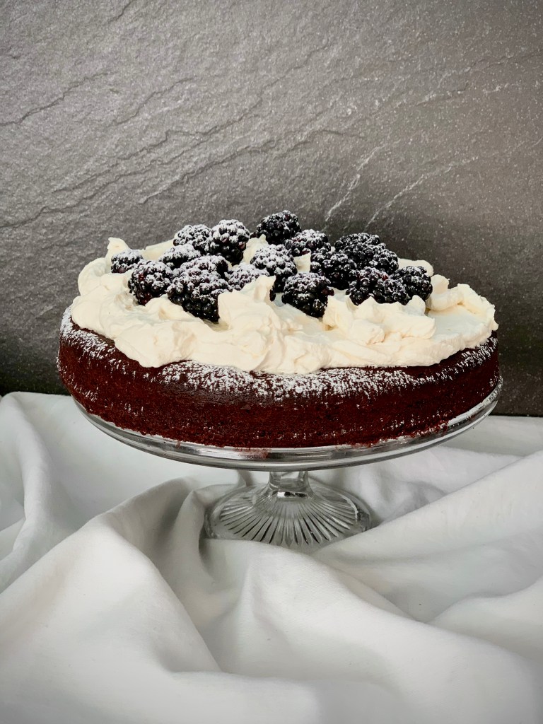 I haven’t so much ‘iced’ this cake as I have whipped some double cream and icing sugar and then topped with some blackberries… which is kind of not an icing at all… however if you did want an icing, I have a wonderful buttercream icing on my Party Cake in my book Kitchen Instinct that would go amazing with this cake, including the blackberries on top.