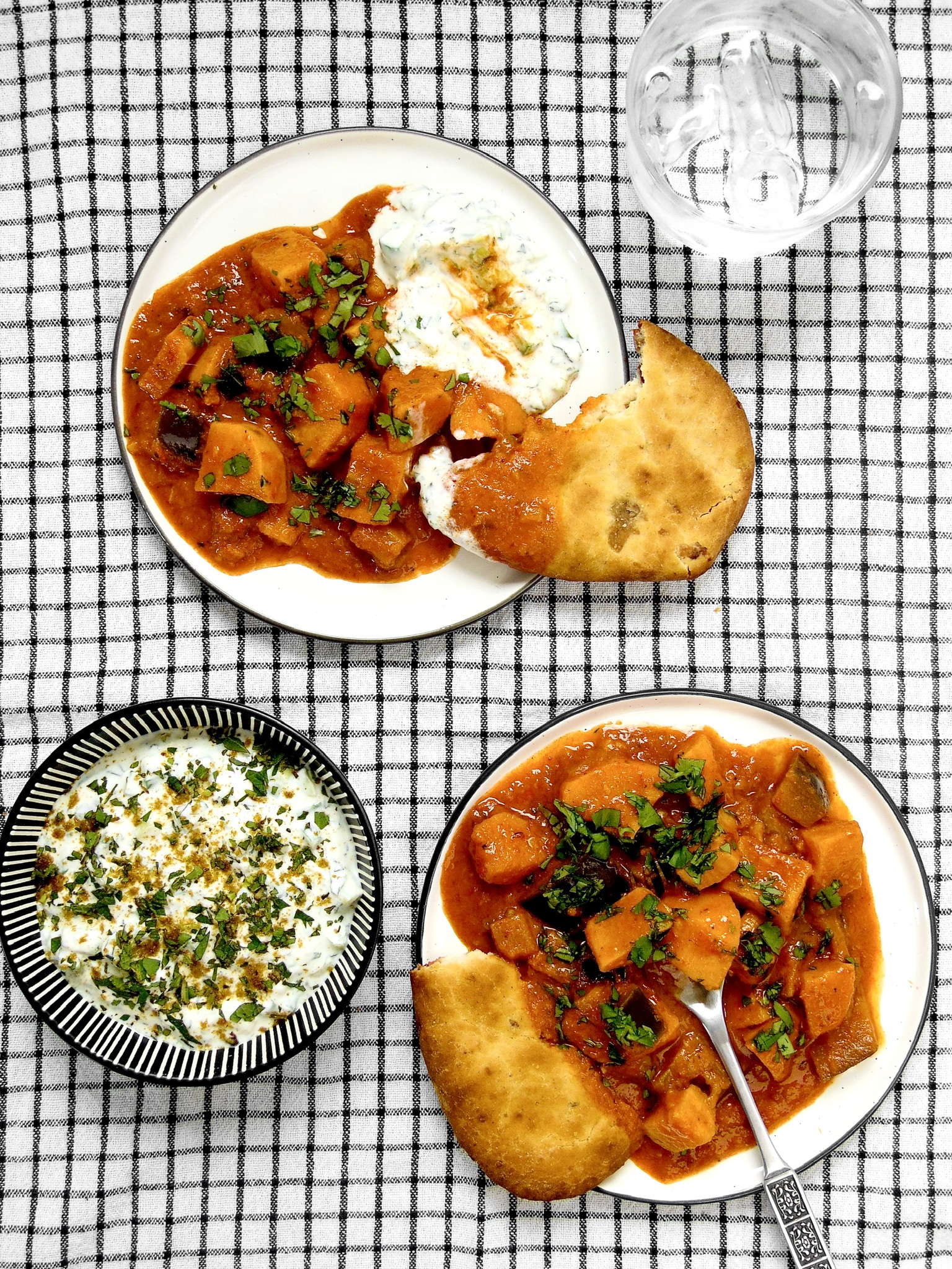 One thought on “AUBERGINE & SWEET POTATO CURRY WITH COCONUT RAITA”