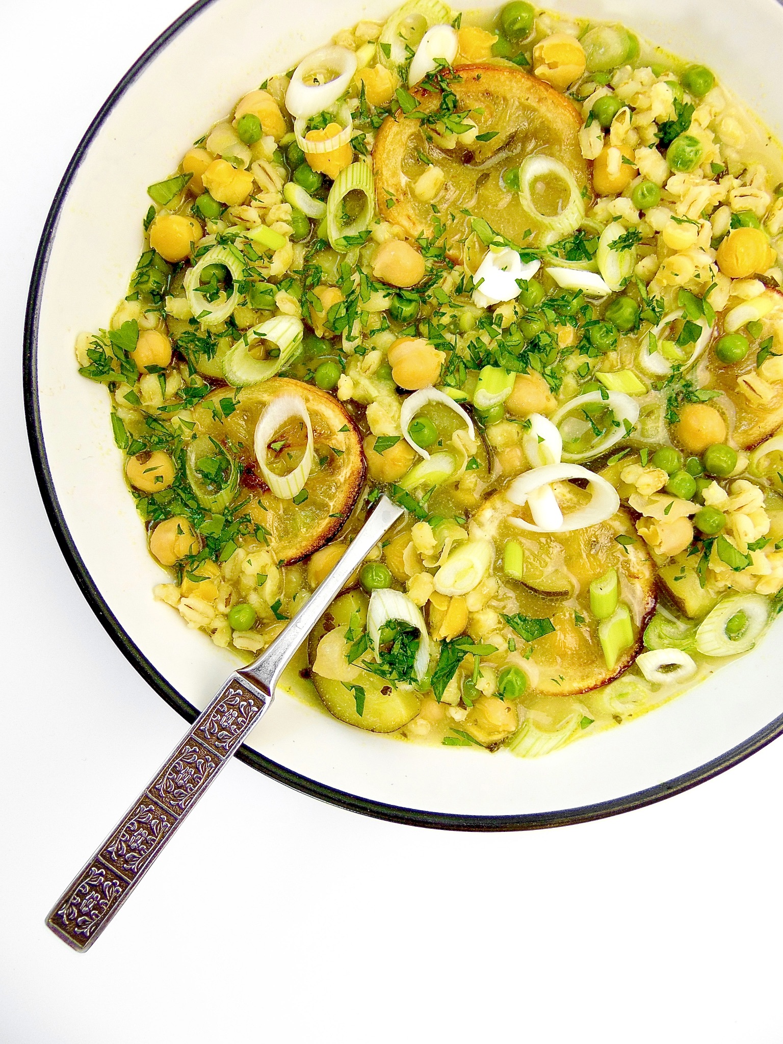- Serve in bowls with some freshly snipped spring onions, a dousing of fresh parsley and a few slices of the roasted lemon.