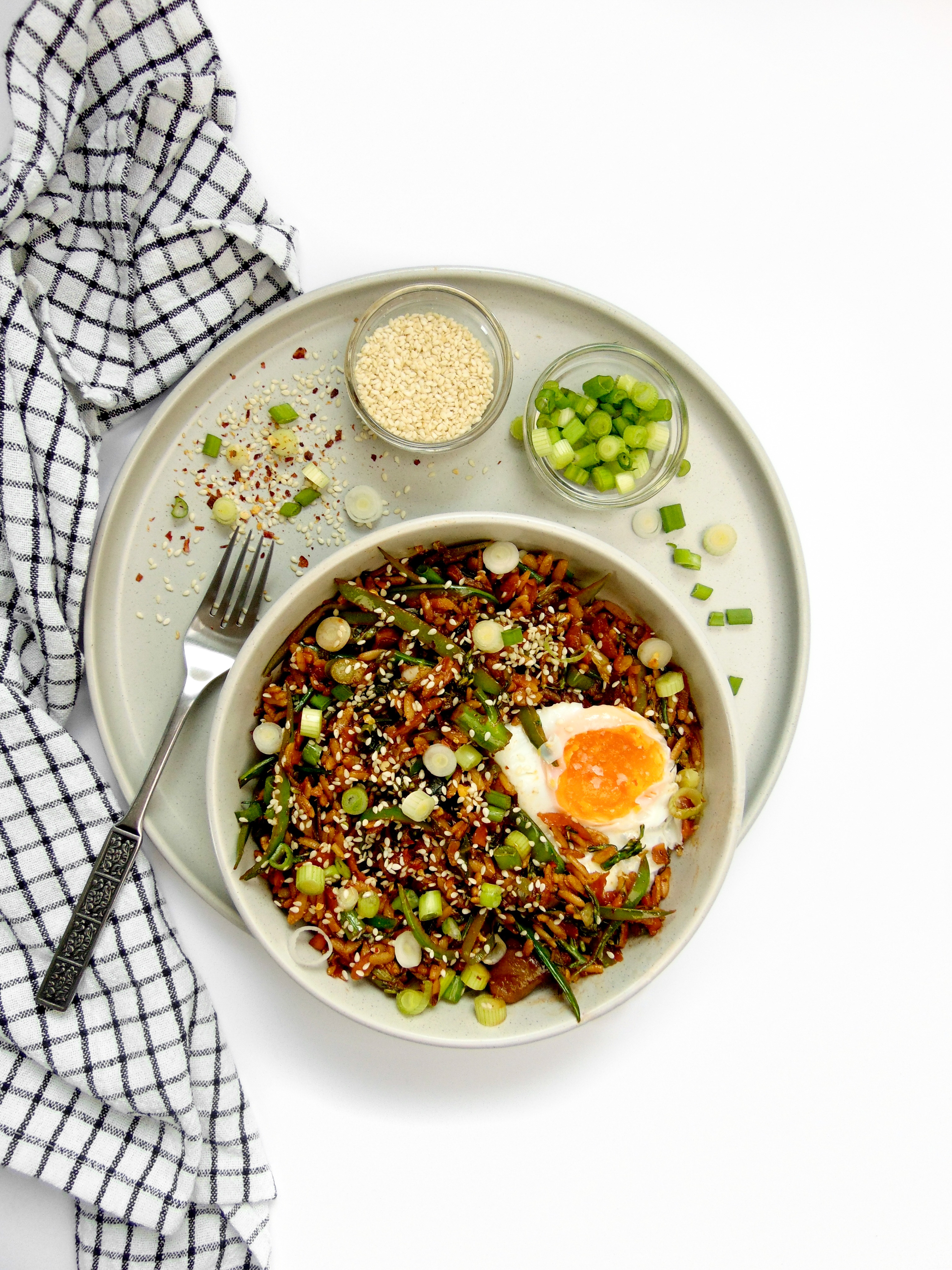 But anyway, you’ll find that this recipe has the flavour profile of a Bibimbap, a Korean dish of mixed rice and vegetables but is served more like a Nasi Goreng, an Indonesian bowl of fried rice. There’s a difference. But here, it sits somewhere in between; inspired by both but being neither, and I wish no disrespect on either dish.