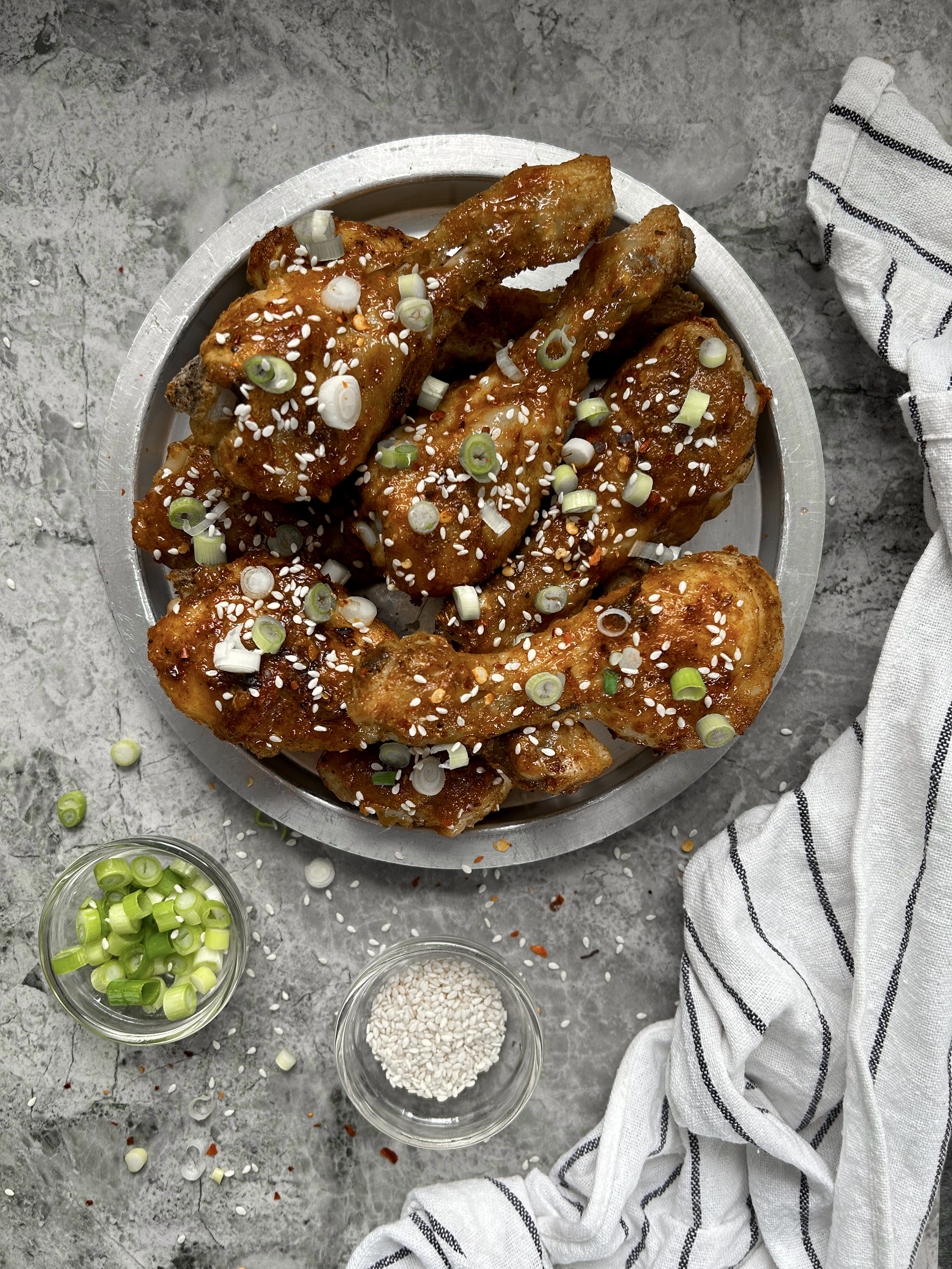 - Remove from the oven and allow to rest, and before serving, scatter with chopped spring onion and sesame seeds. As said, these drumsticks are phenomenal eaten cold, so you could let them cool completely before storing in a sealed tub and keeping in the fridge for up to four days.