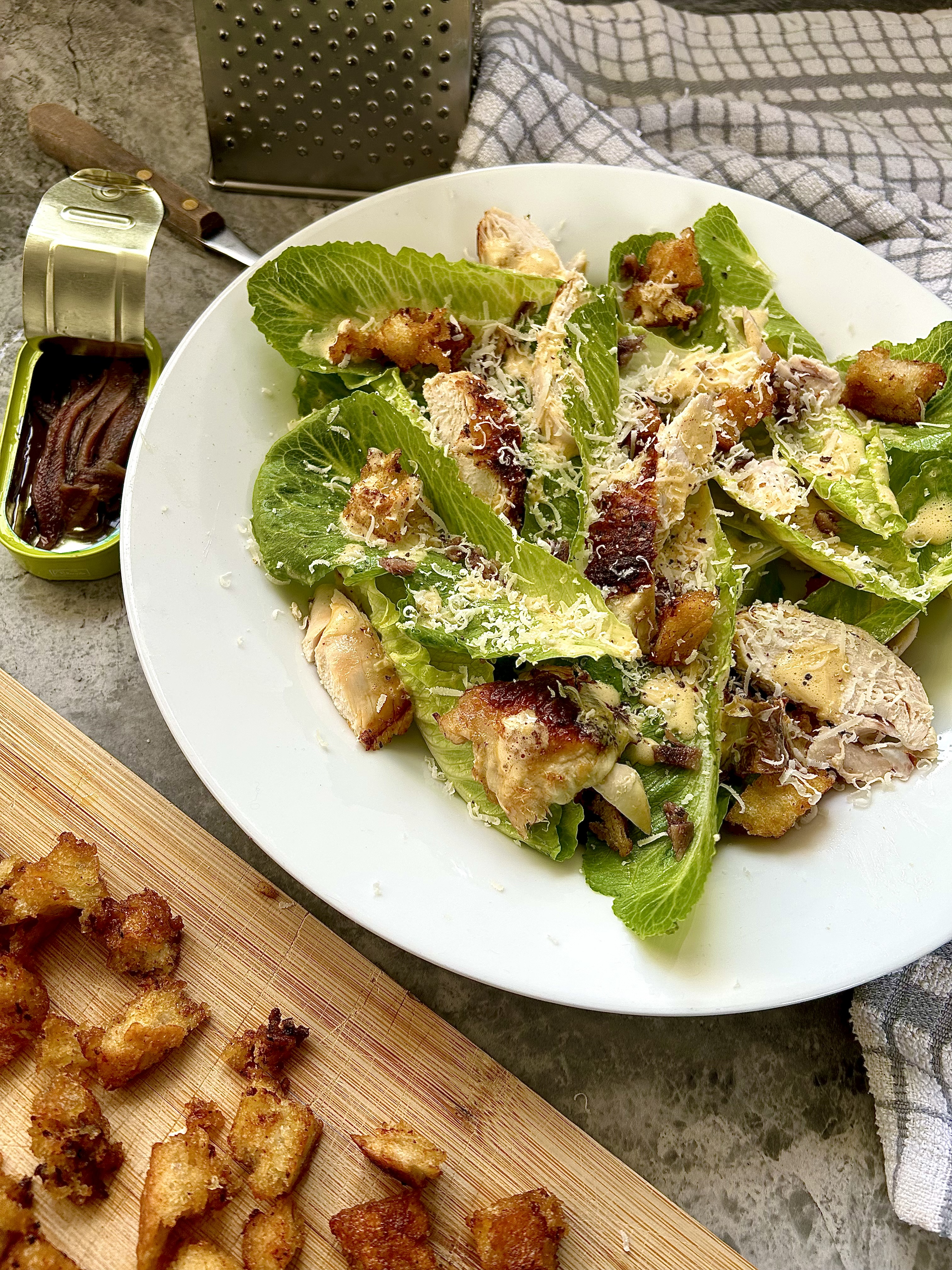 - So I pile some of the lightly dressed leaves on a big plate, and then I tuck some of croutons in and around the leaves. Then, using my hands, I strip the chicken thigh meat from the bone, tucking the meat morsels into little nooks and crannies in the leaves. I then sprinkle over the drained and chopped anchovies, almost as if they were seasonings themselves. Then finally, I pepper the living daylights out of the plate, spoon over a little more of the dressing so that the chicken and crouton chunks are politely anointed, before finally grating over lashings of fresh Parmesan.