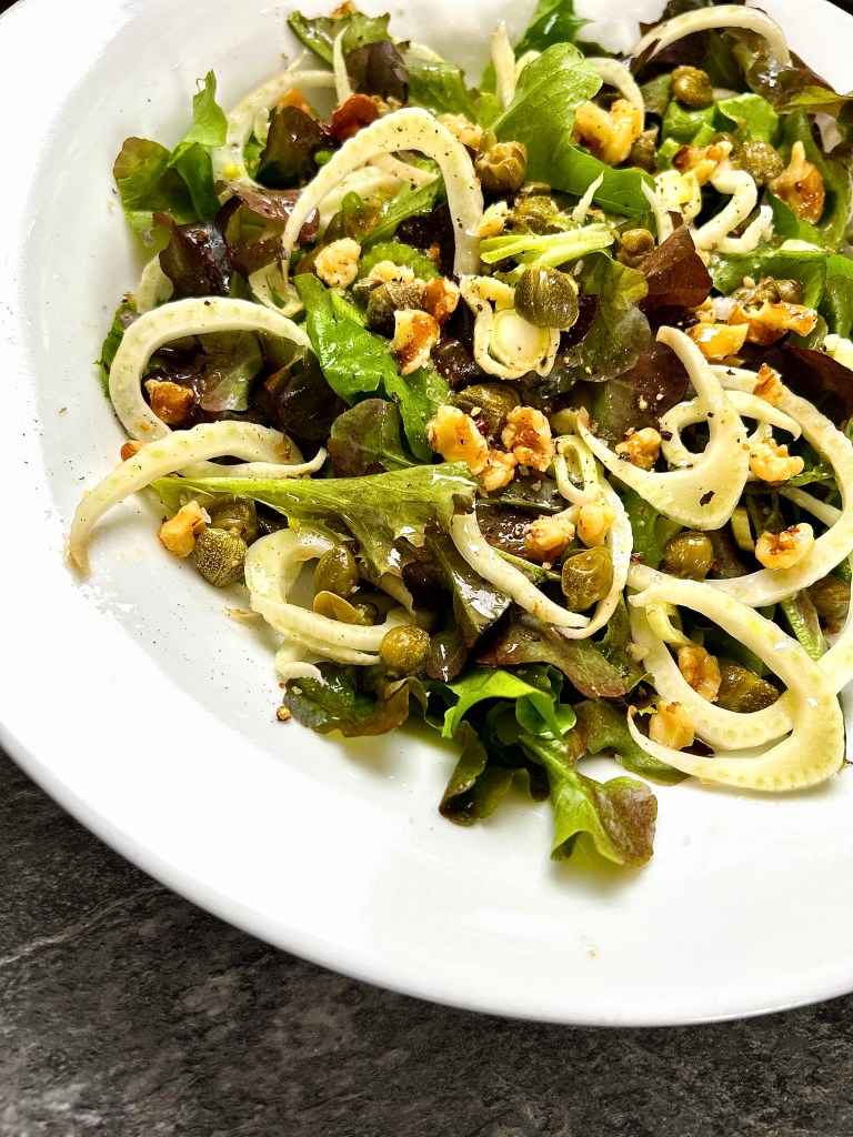 - Add the fennel and celery to the bowl of dressing, along with the leaves (hand torn for ease) and the capers, using your hands to toss everything together so that everything is coated lightly but not drenched.