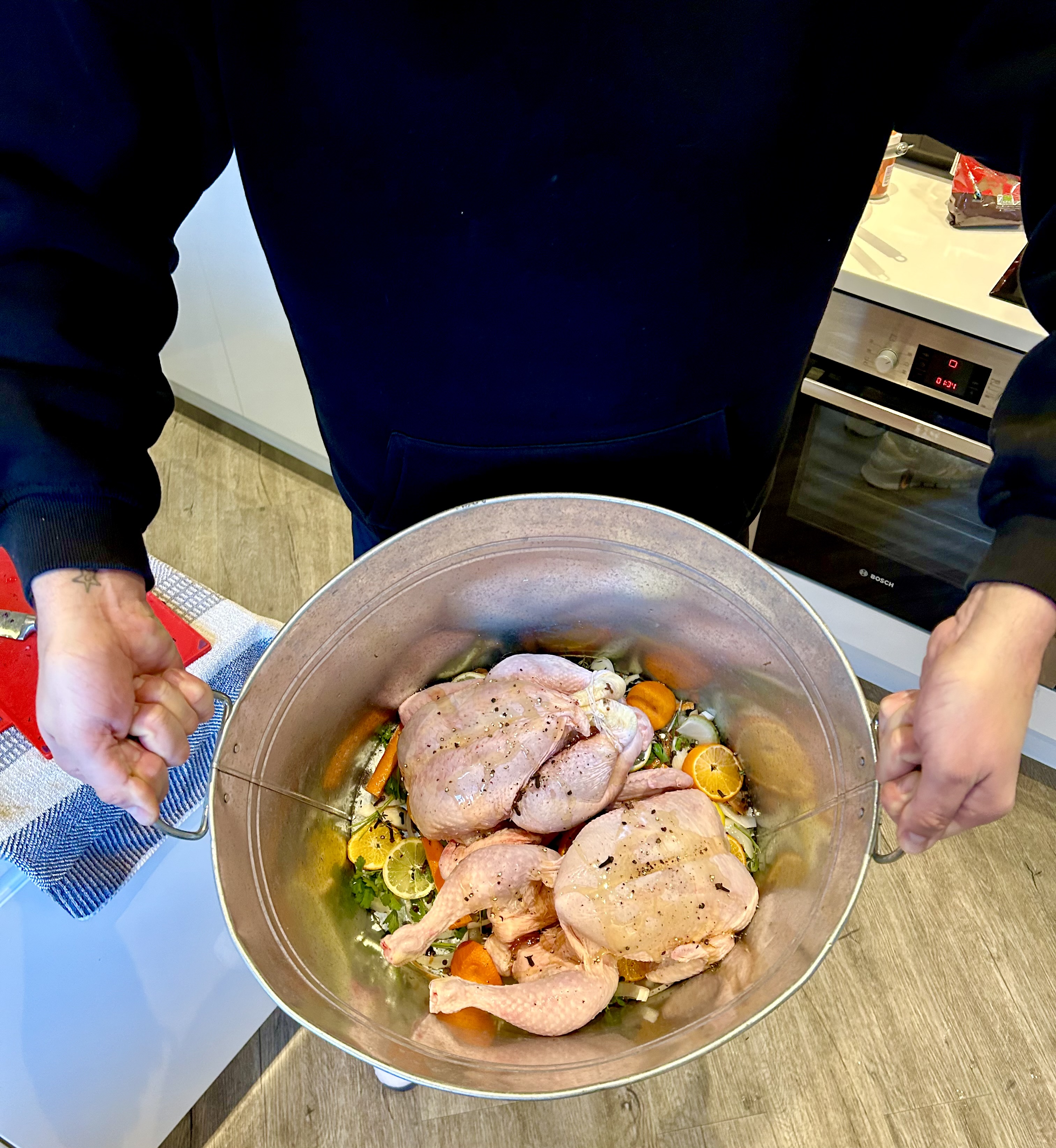 So, if you’ve got two chickens (say 1.5kg each? Roughly?) you’re looking at 3 -4 litres of water to fully submerge them. For something larger, like a turkey, (call it 6-7kg?) you’re aiming more for 8 – 10 litres to cover the birds.
